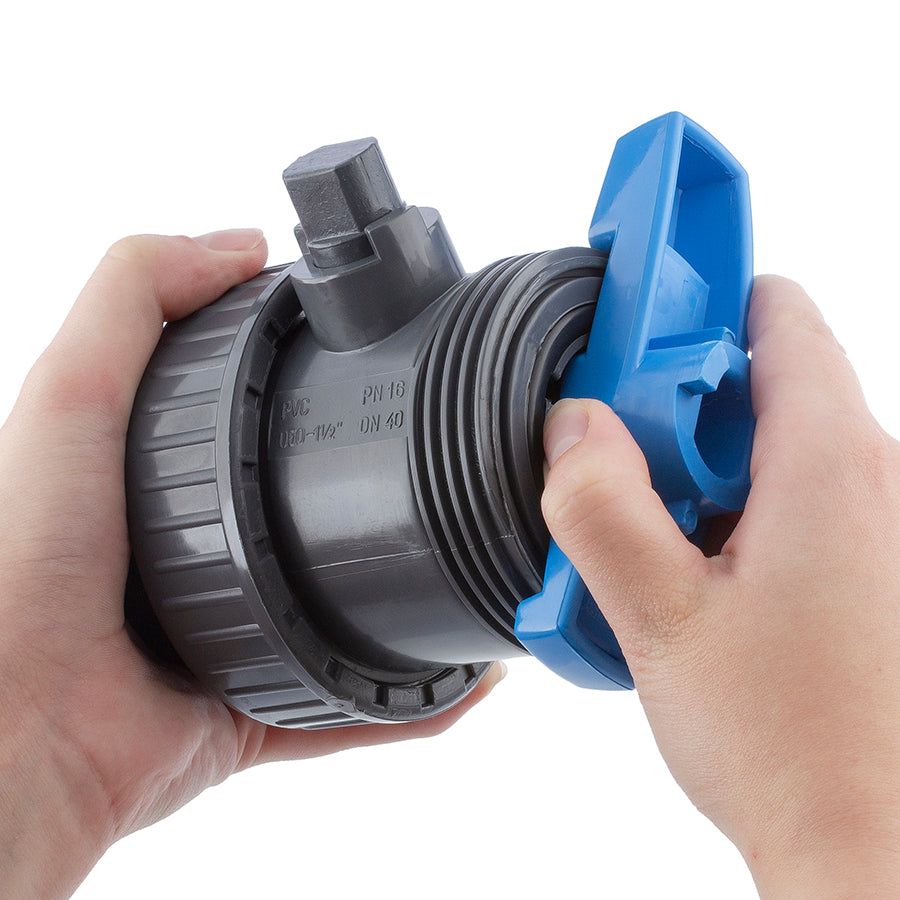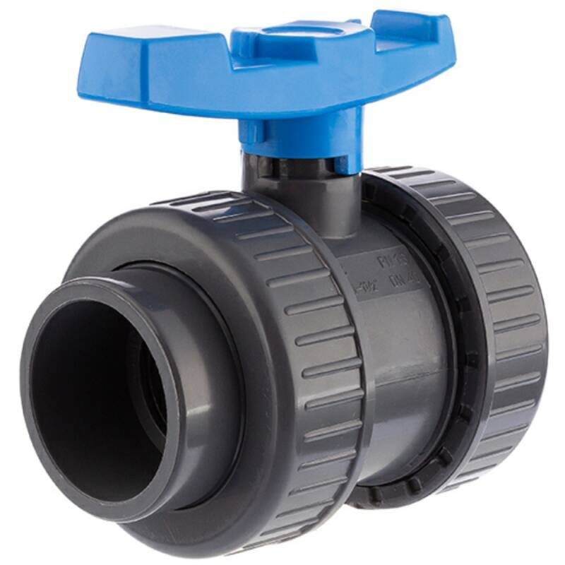 Dieser professionelle Kugelhahn aus robustem PVC-U ist mit zwei Klebemuffen und Überwurfmuttern ausgestattet. Die beidseitige Durchflussrichtung ermöglicht flexible Installation – perfekt geeignet für komplexe Wassersysteme.